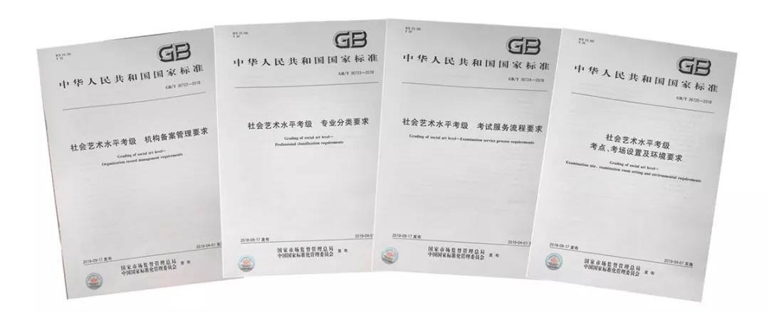 社会艺术水平考级服务的四项推荐性国家标准GB/T 36722-2018《社会艺术水平考级 机构备案管理要求》GB/T 36723-2018《社会艺术水平考级 专业分类要求》、GB/T 36724-2018《社会艺术水平考级 考试服务流程要求》、GB/T 36725-2018《社会艺术水平考级 考点、考场设置及环境要求》,于2019年4月1日起正式实施。
